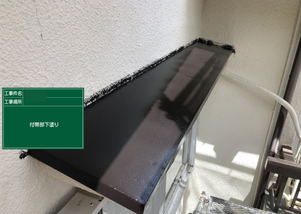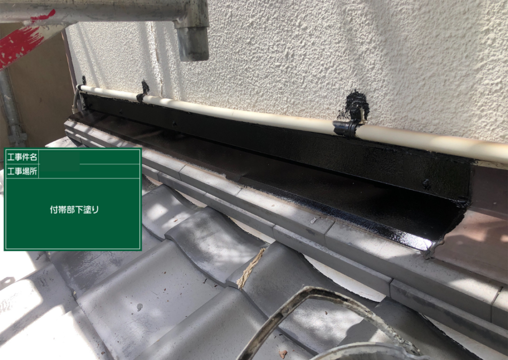 外壁屋根塗装同様、全体をしっかり高圧洗浄とケレンをしたら、1回目の塗装です。下塗り(したぬり)といいますが鉄部の場合は。さび止めをぬります。外壁塗装同様、原則、下塗り(さび止め)、中塗り、仕上げ塗り(上塗り)の3回です。(下写真)