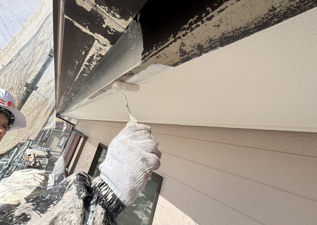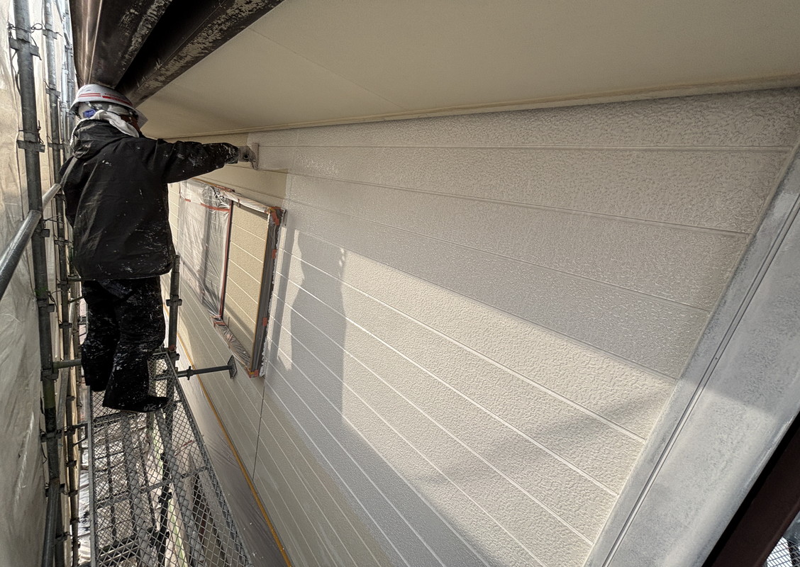 きれいに下塗り材の上に色がのっていきます。しかし、傷んだ外壁の場合は、外壁材に吸い込まれていくこともあり、規定以上のたくさんの塗料を使うこともあります。綺麗に長持ちするように心込めて塗ります。