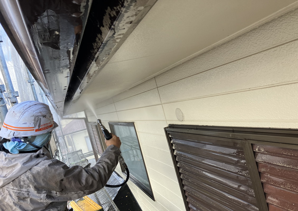 塗装の前に高圧洗浄で、コケや汚れ、黒ずみ、旧塗膜等をしっかり落としていきます!高圧洗浄でしっかりと旧塗膜や汚れを落としておくことで、塗料の密着性を良くする効果を発揮できるからです。
