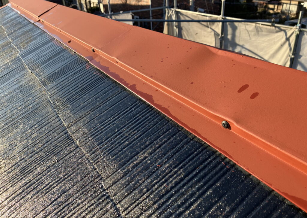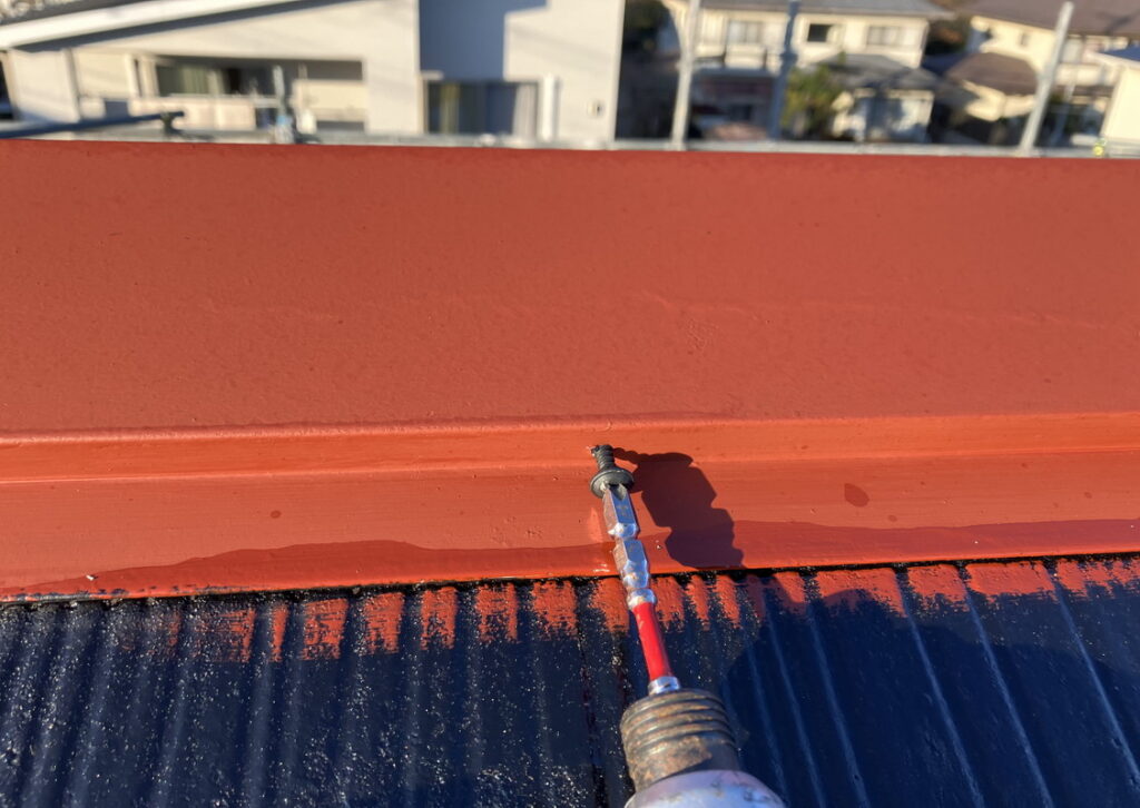 棟が飛ばないようしっかり固定すること、また、ビス頭をコーキングしてしっかり水の侵入を防ぎます。