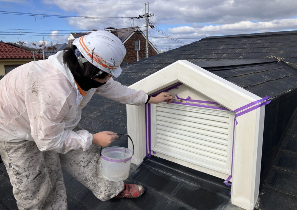 そして、次は、いよいよ中塗りです。今回は、お客様が選んでくれたピンクベージュですね。塗料は外壁観音ペイントと屋根観音ペイントです。