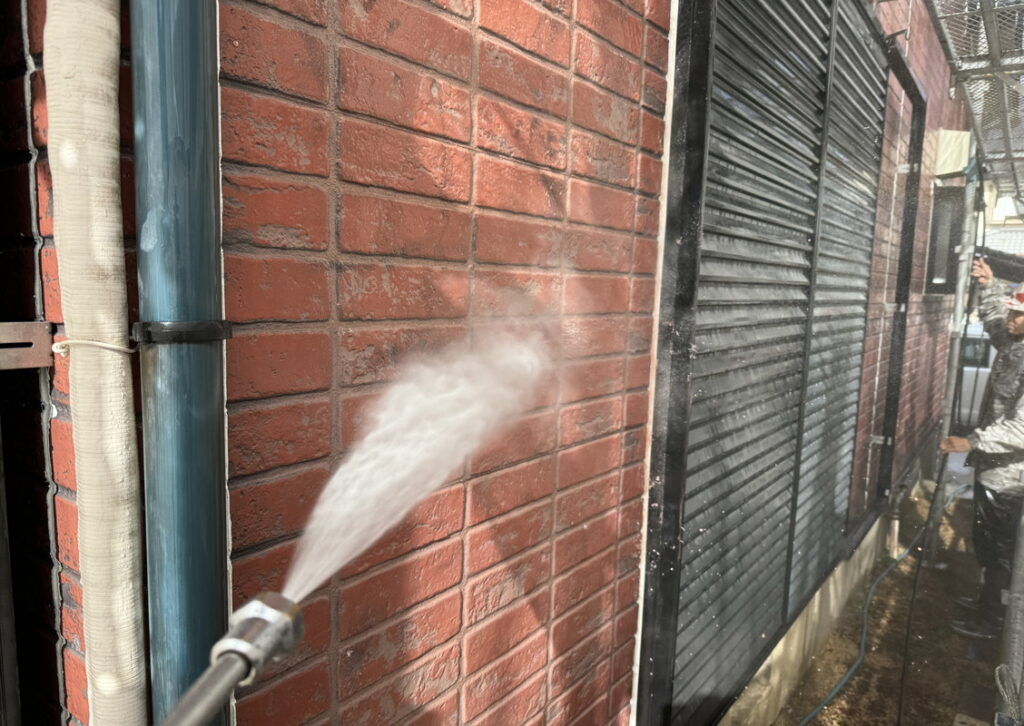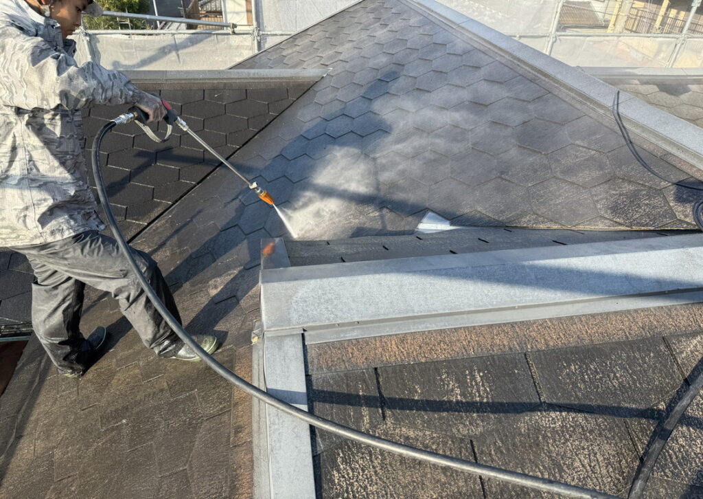 まず、塗装の前に高圧洗浄で、コケや汚れ、黒ずみ、旧塗膜等をしっかり落としていきます!高圧洗浄でしっかりと旧塗膜や汚れを落としておくことで、塗料の密着性を良くする効果を発揮できるからです。外壁屋根が綺麗になっていくに様子は感動の塗り替えリフォームの始まりです。夏はとても楽しい仕事でもありますが、寒い冬は身体もびしょ濡れになり大変な作業でもあります。が職人さんは外壁から屋根にあがり手際よく作業していきます。
