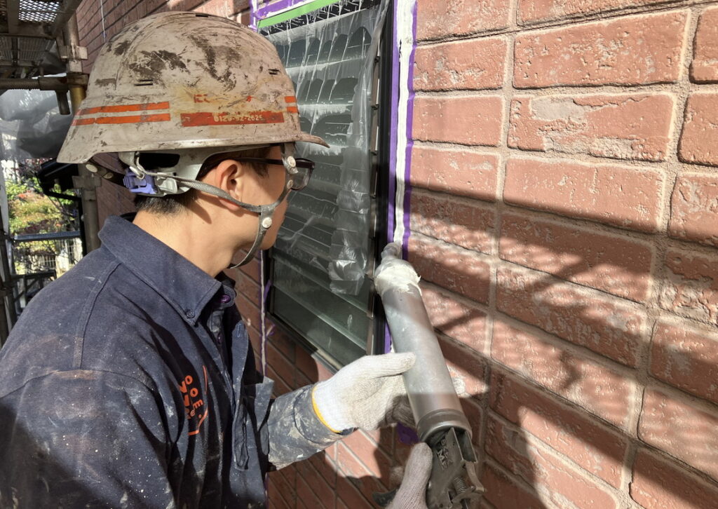 全体をしっかり高圧洗浄したら、1回目の塗装です。下塗り(したぬり)といいます。外壁の種類により、下塗り塗料はシーラとフィラーと2種類の下塗り塗料に分かれますが下地材に適した塗料を使用します。原則、下塗り、中塗り、仕上げ塗り(上塗り)をしっかり、たっぷり 3回塗りです。吸い込みが激しい場合は2回塗る時もあります。