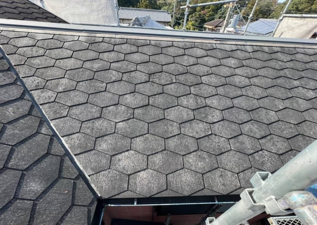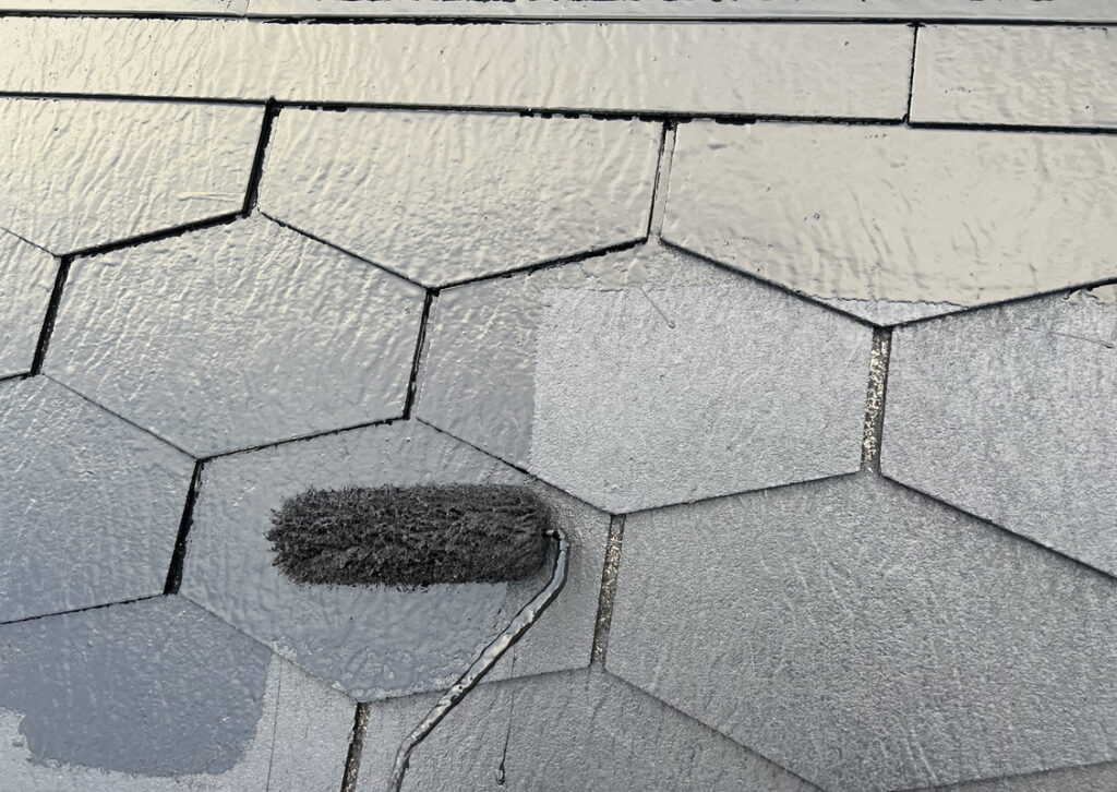 そして、次は、いよいよ中塗り(なかぬり)です。外壁の色は、関西ペイントのアレスダイナミックトップ15-40D(ブラウン部分)、N-30(濃いグレー部分)、屋根は水谷ペイントのバイオマスR-Si ノースブラックです。傷んだ外壁の場合は、外壁材に吸い込まれていくことも多くあり、規定以上のたくさんの塗料を使うこともあります。綺麗に長持ちするように心込めて塗ります。