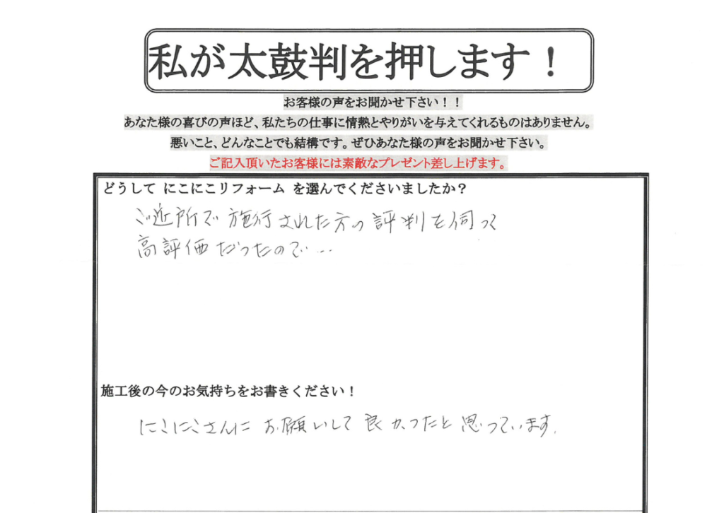 色決めのお打ち合わせに何度も足を運んでいただき、私自身もH様のお家の完成を心待ちにしておりました。出来上がりに満足していただき、社員一同大変嬉しく思います。今後も何かございましたらいつでもご連絡下さい。