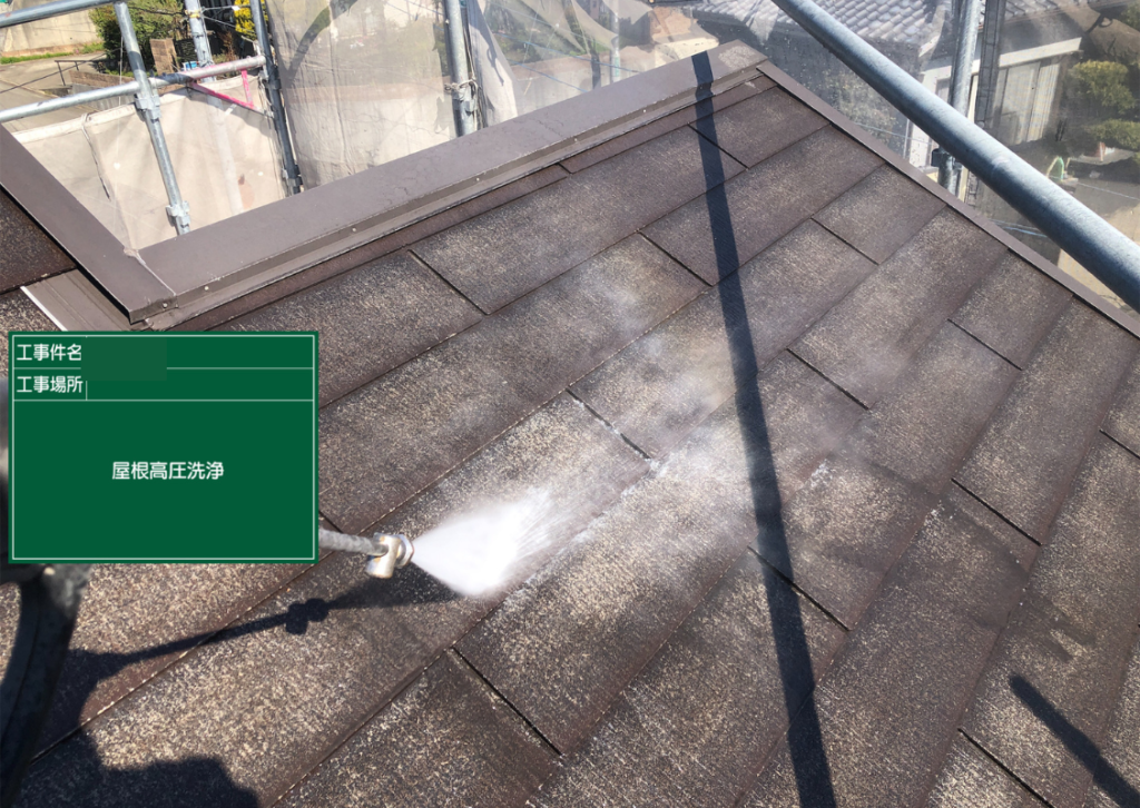 まず、塗装の前に高圧洗浄で、コケや汚れ、黒ずみ、旧塗膜等をしっかり落としていきます!高圧洗浄でしっかりと旧塗膜や汚れを落としておくことで、塗料の密着性を良くする効果を発揮できるからです。