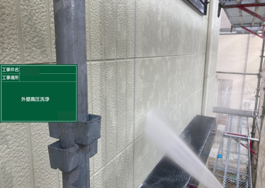 まず、塗装の前に高圧洗浄で、コケや汚れ、黒ずみ、旧塗膜等をしっかり落としていきます!高圧洗浄でしっかりと旧塗膜や汚れを落としておくことで、塗料の密着性を良くする効果を発揮できるからです。