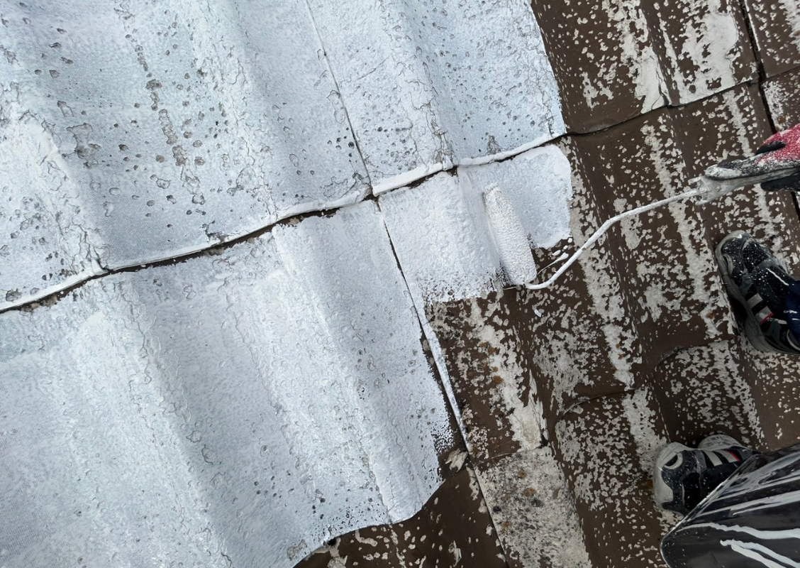 そして、次は、いよいよ中塗りです。今回は、お客様が選んでくれたのは外壁はベージュ、屋根はグレーです。塗料は外壁が関西ペイント アレスダイナミックTOP、屋根がにこにこ観音ペイント 観音シリコンです。