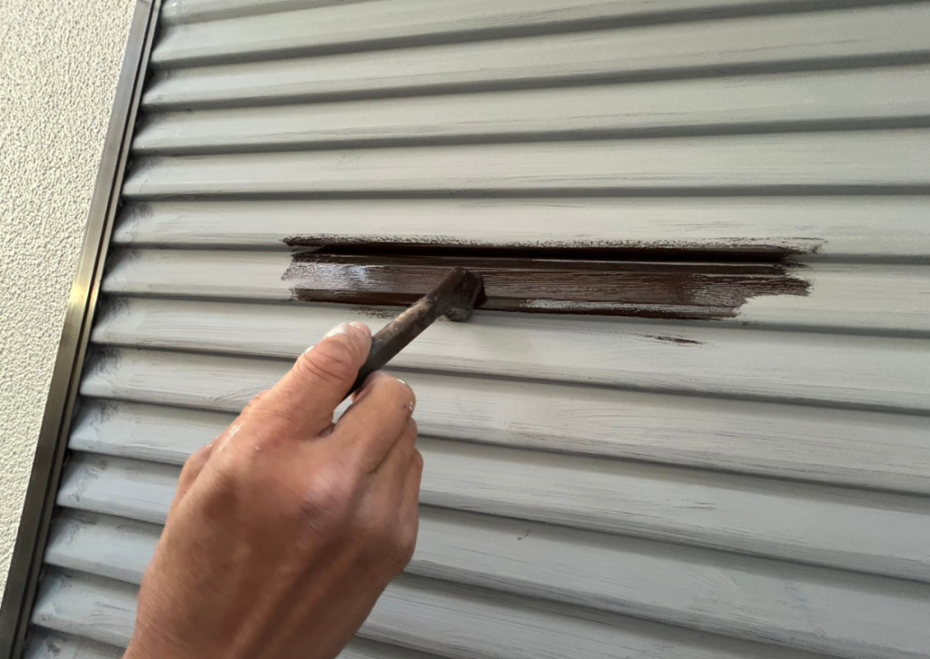 外壁屋根塗装同様、全体をしっかり高圧洗浄とケレンをしたら、1回目の塗装です。下塗り(したぬり)といいますが鉄部の場合は。さび止めをぬります。外壁塗装同様、原則、下塗り(グレーさび止め)、中塗り、仕上げ塗り(上塗り)の3回です。(下写真)