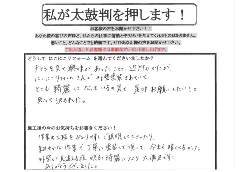 チラシを見て興味があったことと、近所のかたがにこにこリフォームさんで外壁馳走をされていて、とても綺麗になっているのを見て、是非お願いしたい!と思って決めました。