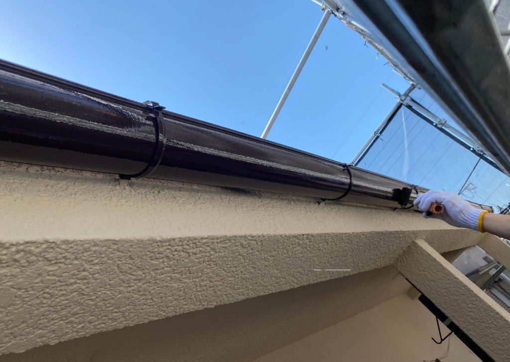そして、いよいよ仕上げ塗り(上塗り-うわぬり)です。時には中塗りでしっかりと塗ったのに、経年劣化等により、傷みが激しい場合には、中塗りでもまだ下が透けてしまうこともあります。
