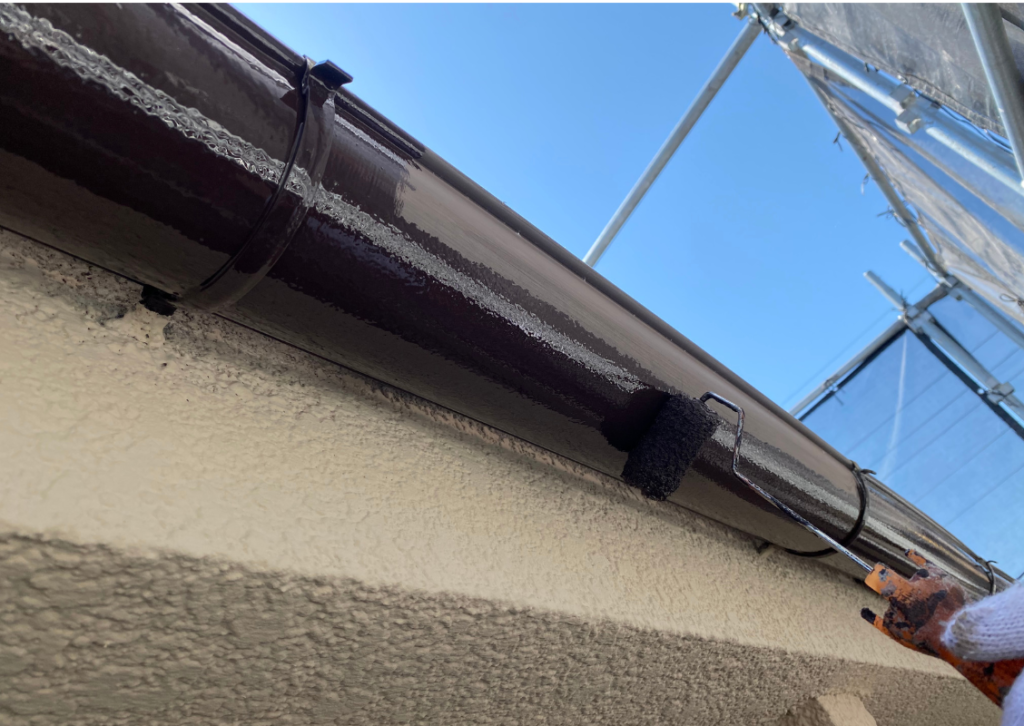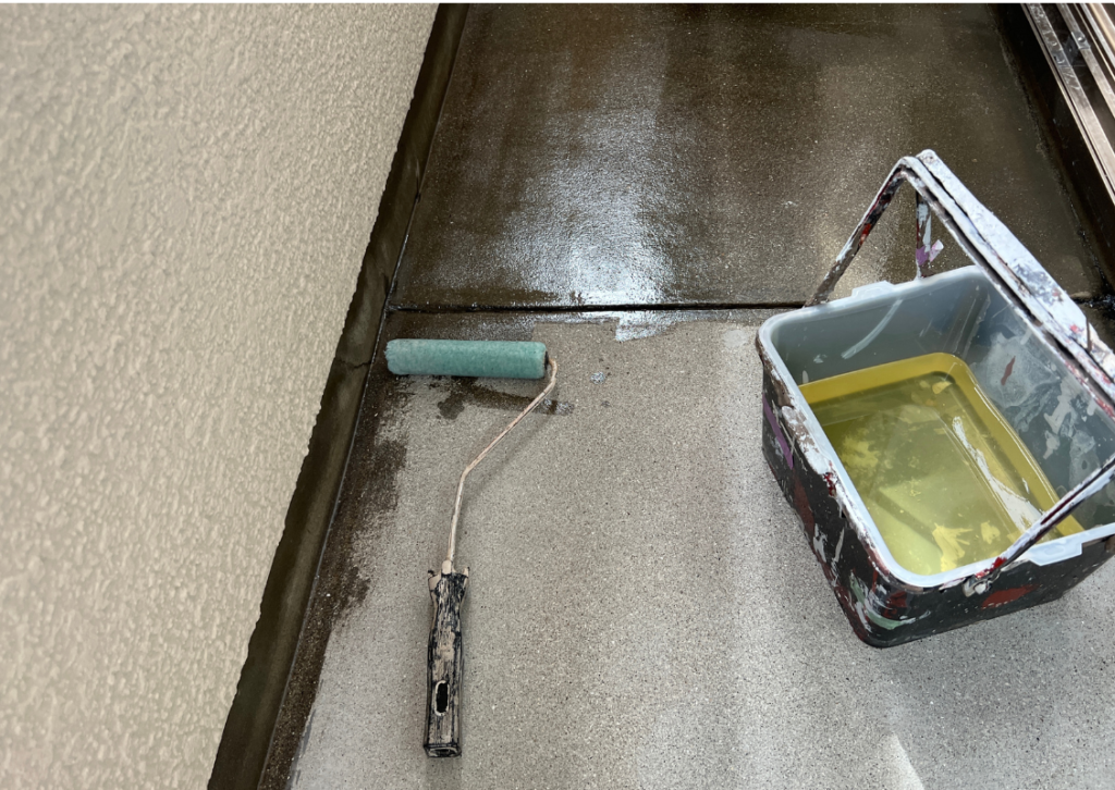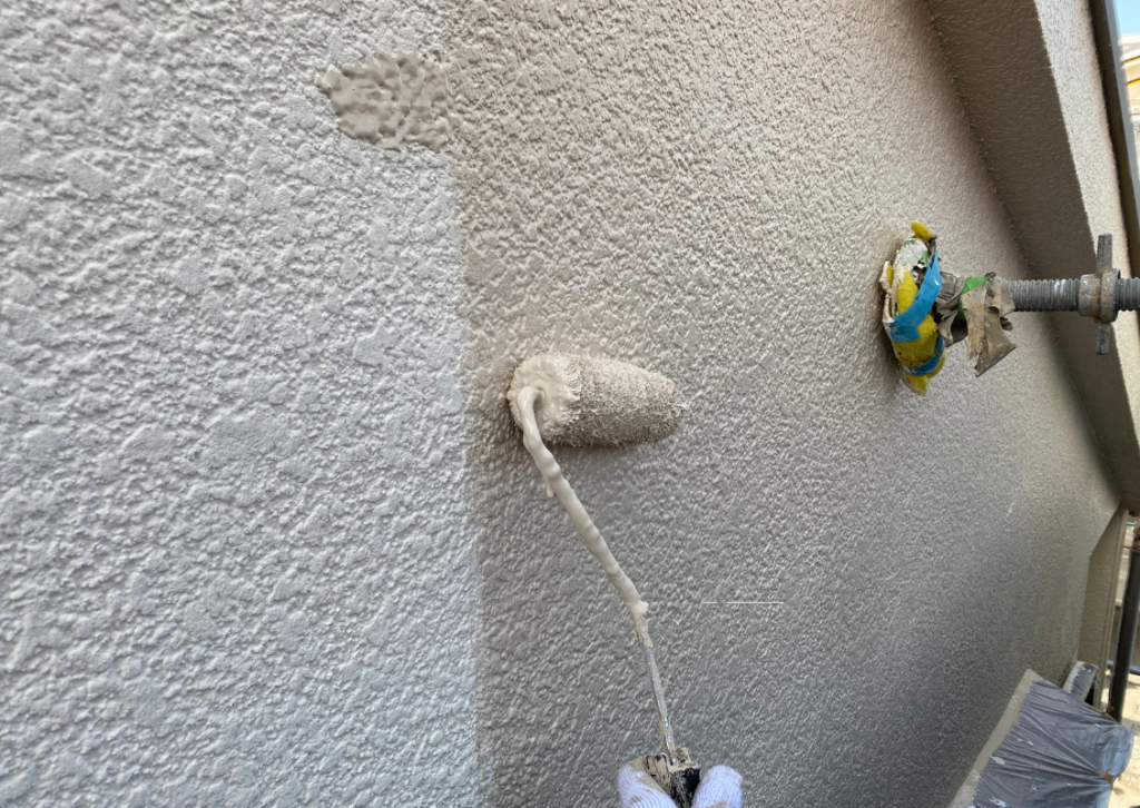 全体をしっかり高圧洗浄したら、1回目の塗装です。下塗り(したぬり)といいます。単層と複層塗料の違いで工程が変わる場合がありますが、原則、下塗り、中塗り、仕上げ塗り(上塗り)の3回です。