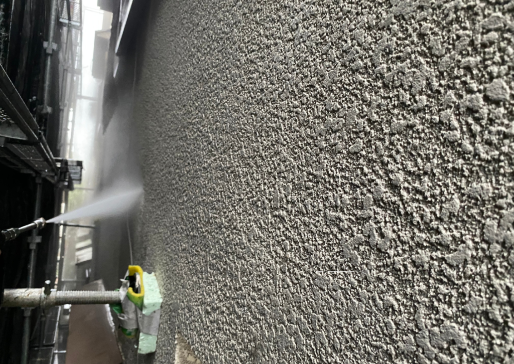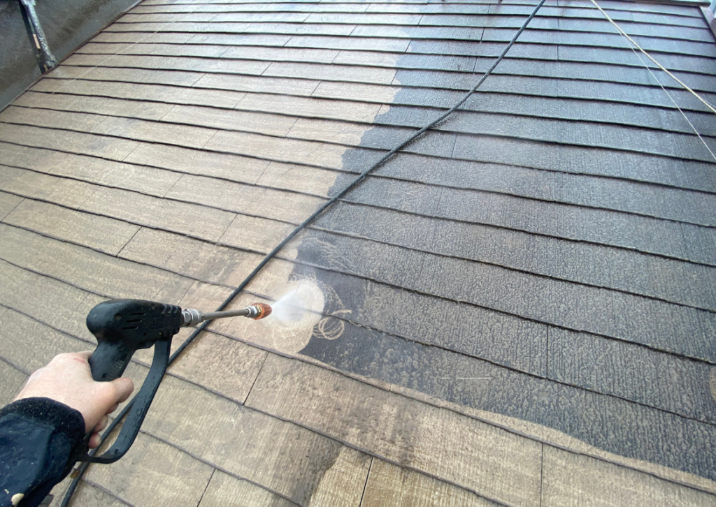 まず、塗装の前に高圧洗浄で、コケや汚れ、黒ずみ、旧塗膜等をしっかり落としていきます!高圧洗浄でしっかりと旧塗膜や汚れを落としておくことで、塗料の密着性を良くする効果を発揮できるからです。