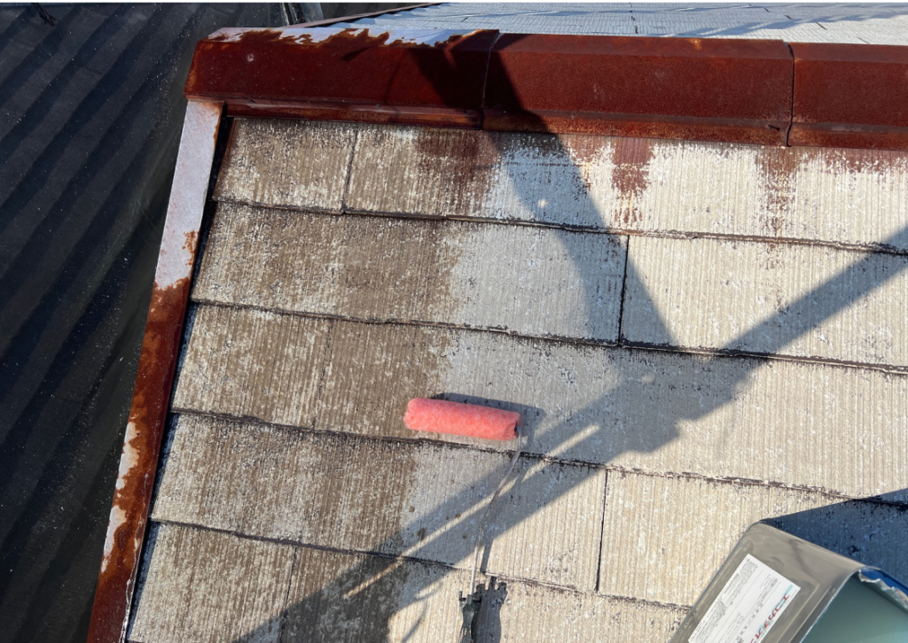 外壁屋根塗装同様、全体をしっかり高圧洗浄とケレンをしたら、1回目の塗装です。下塗り(したぬり)といいますが鉄部の場合は。さび止めをぬります。外壁塗装同様、原則、下塗り(さび止め)、中塗り、仕上げ塗り(上塗り)の3回です。(下写真)