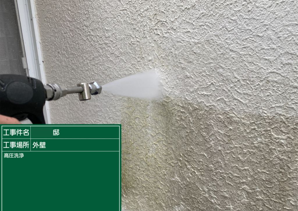 まず、塗装の前に高圧洗浄で、コケや汚れ、黒ずみ、旧塗膜等をしっかり落としていきます!高圧洗浄でしっかりと旧塗膜や汚れを落としておくことで、塗料の密着性を良くする効果を発揮できるからです。