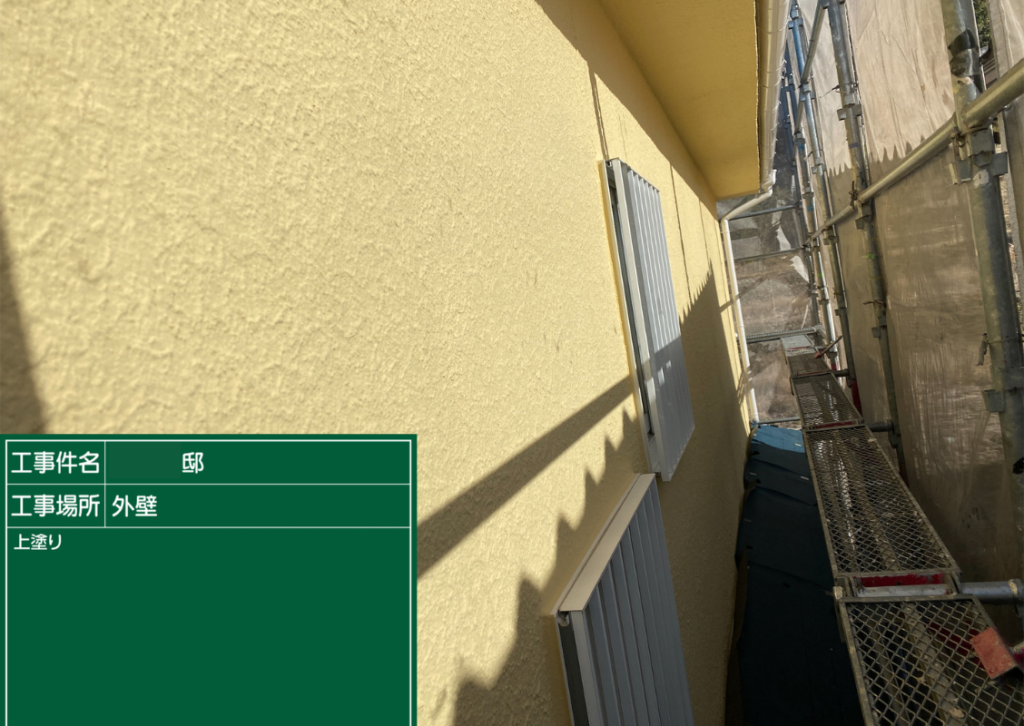 そして、いよいよ仕上げ塗り(上塗り-うわぬり)です。時には中塗りでしっかりと塗ったのに、経年劣化等により、傷みが激しい場合には、中塗りでもまだ下が透けてしまうこともあります。