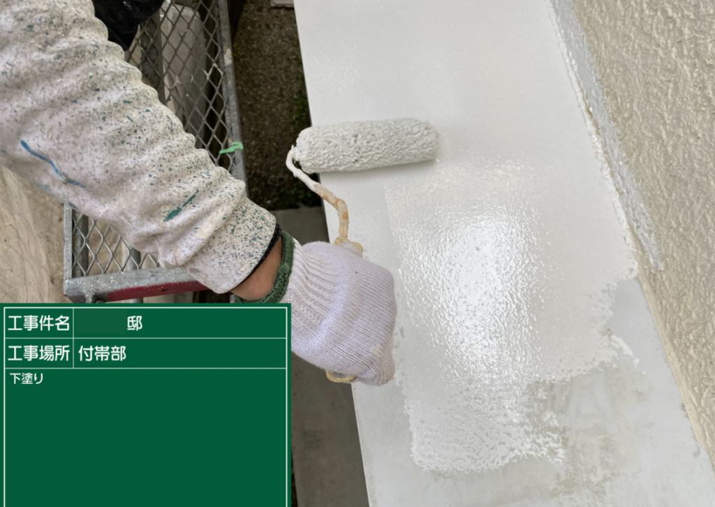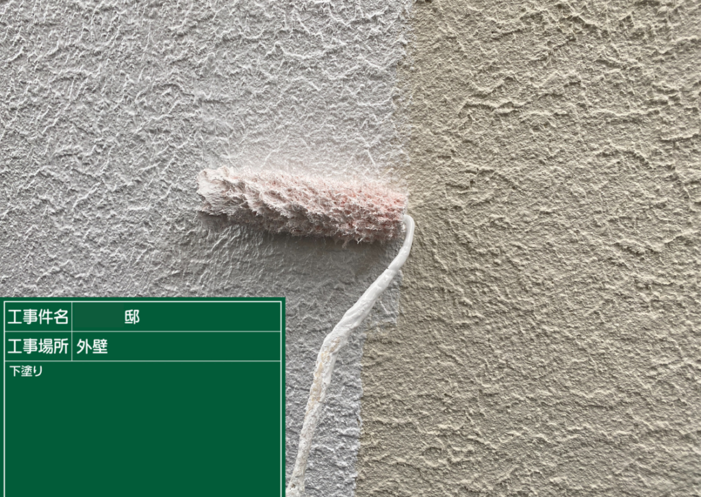 全体をしっかり高圧洗浄したら、1回目の塗装です。下塗り(したぬり)といいます。単層と複層塗料の違いで工程が変わる場合がありますが、原則、下塗り、中塗り、仕上げ塗り(上塗り)の3回です。