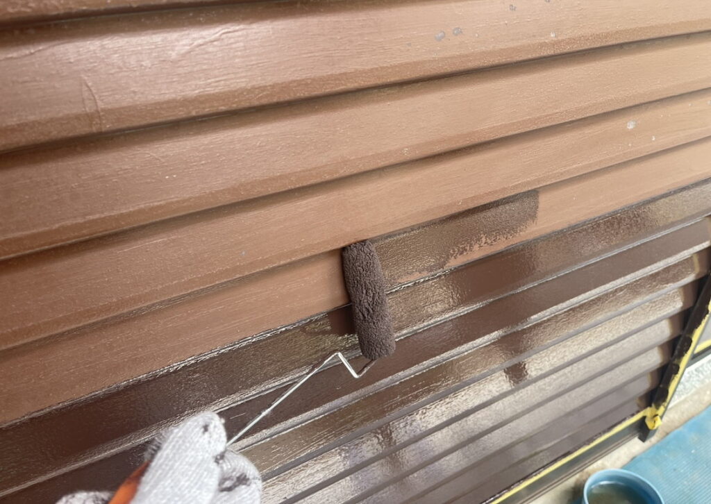 そして、いよいよ仕上げ塗り(上塗り-うわぬり)です。時には中塗りでしっかりと塗ったのに、経年劣化等により、傷みが激しい場合には、中塗りでもまだ下が透けてしまうこともあります。