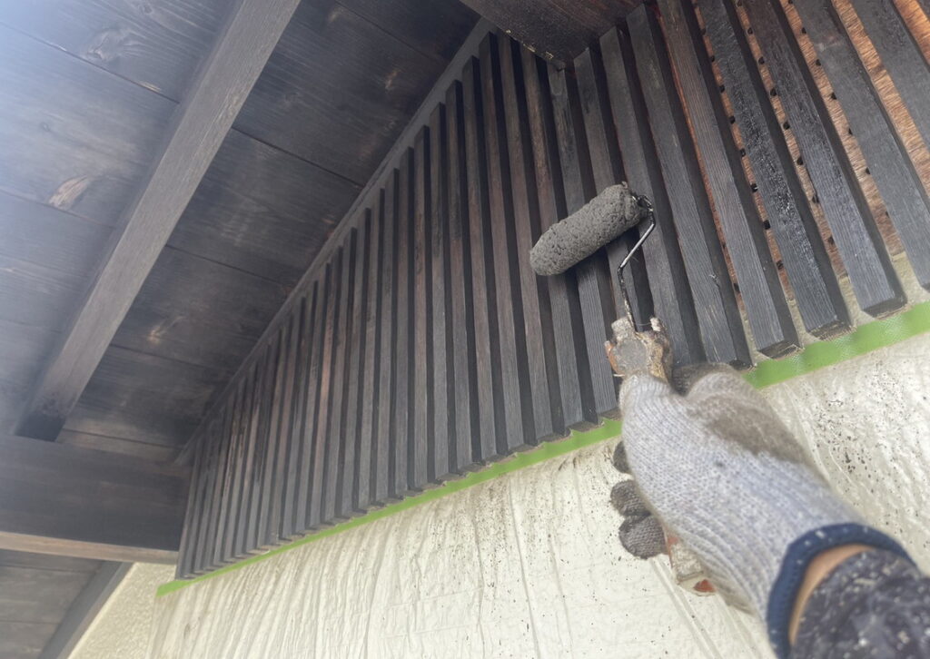 上塗りの写真です。木部には木が吸い込んでくれる「ニューボンデンDx」という防虫、防水もしてくれる塗料を塗りました。