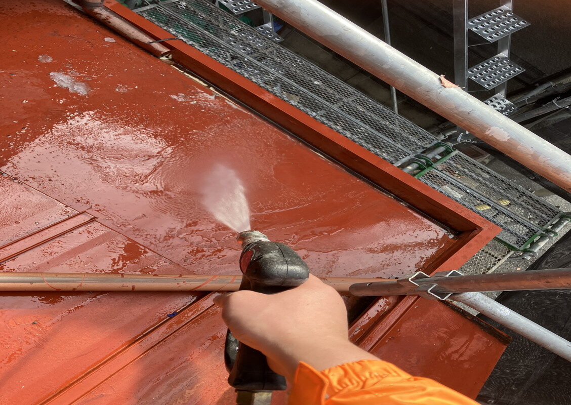 塗装の前に高圧洗浄で、コケや汚れ、黒ずみ、旧塗膜等をしっかり落としていきます!高圧洗浄でしっかりと旧塗膜や汚れを落としておくことで、塗料の密着性を良くする効果を発揮できるからです。