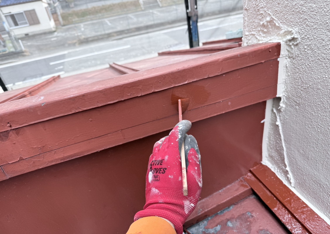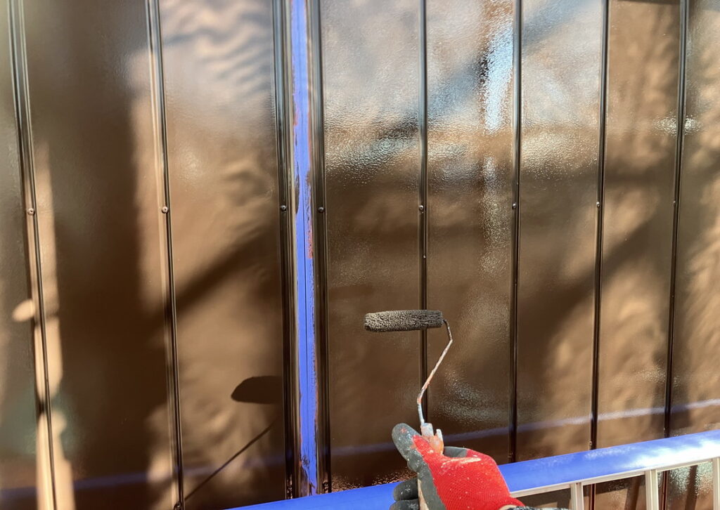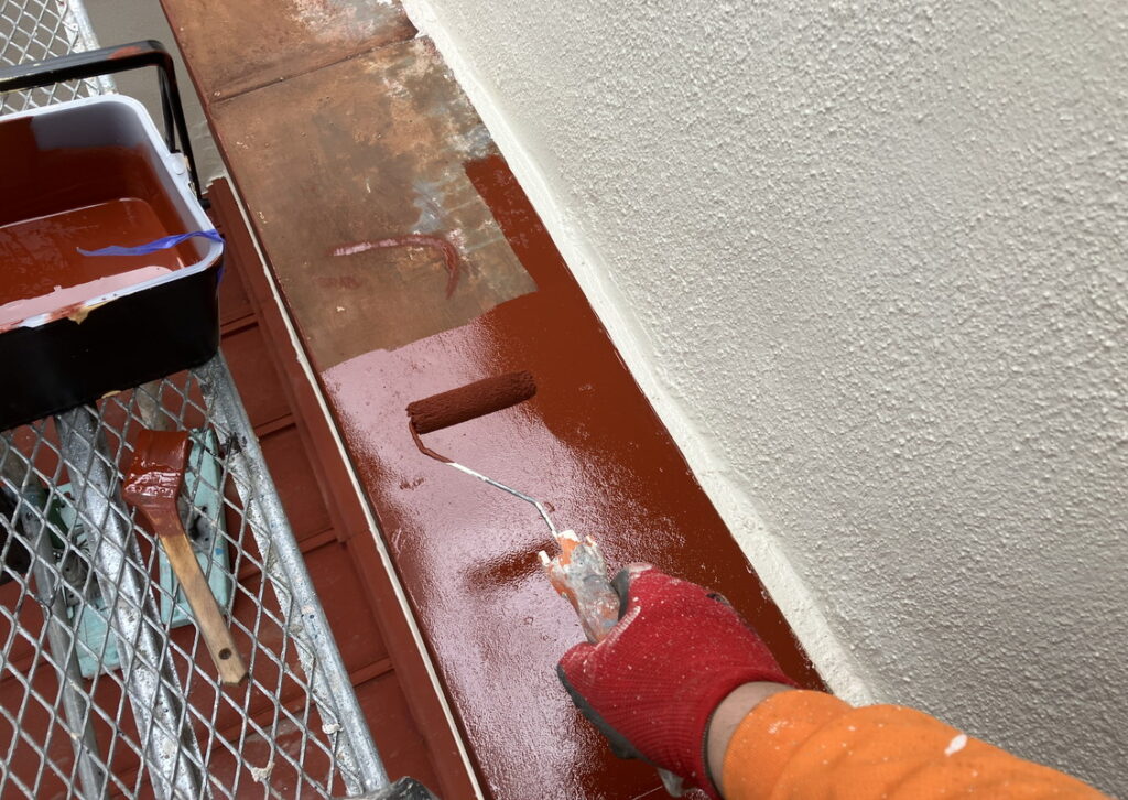 外壁屋根塗装同様、全体をしっかり高圧洗浄とケレンをしたら、1回目の塗装です。下塗り(したぬり)といいますが鉄部の場合は。さび止めをぬります。外壁塗装同様、原則、下塗り(さび止め)、中塗り、仕上げ塗り(上塗り)の3回です。(下写真)