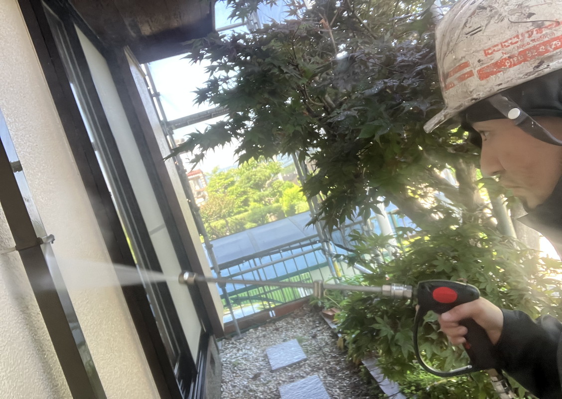 塗装の前に高圧洗浄で、コケや汚れ、黒ずみ、旧塗膜等をしっかり落としていきます!高圧洗浄でしっかりと旧塗膜や汚れを落としておくことで、塗料の密着性を良くする効果を発揮できるからです。