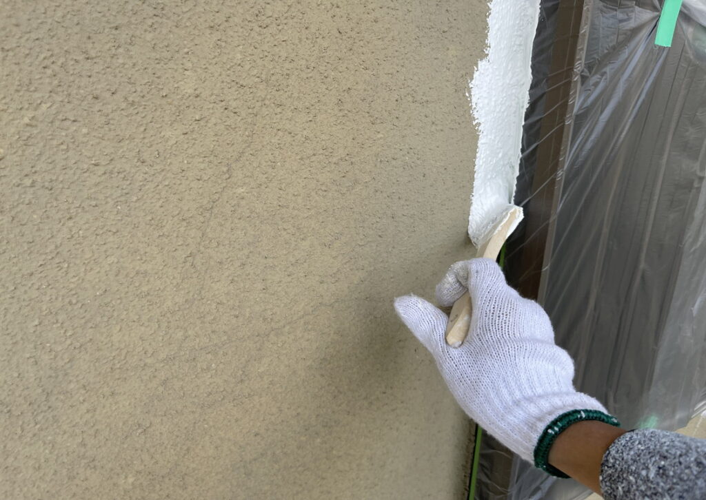 全体をしっかり高圧洗浄したら、1回目の塗装です。下塗り(したぬり)といいます。単層と複層塗料の違いで工程が変わる場合がありますが、原則、下塗り、中塗り、仕上げ塗り(上塗り)の3回です。
