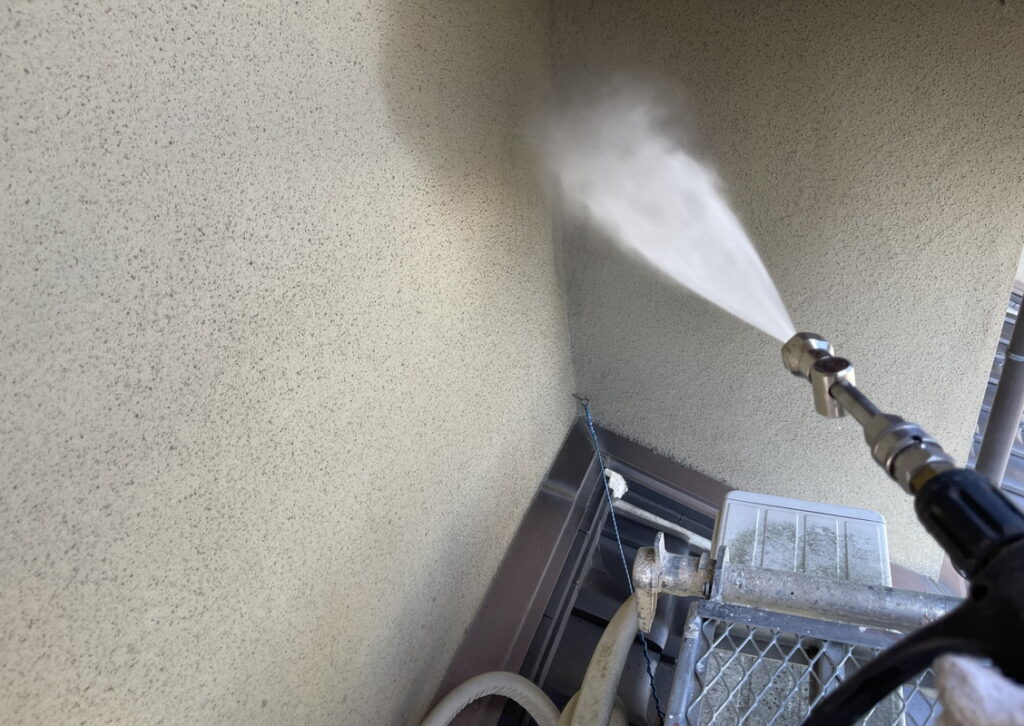 まず、塗装の前に高圧洗浄で、コケや汚れ、黒ずみ、旧塗膜等をしっかり落としていきます!高圧洗浄でしっかりと旧塗膜や汚れを落としておくことで、塗料の密着性を良くする効果を発揮できるからです。