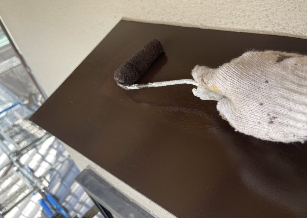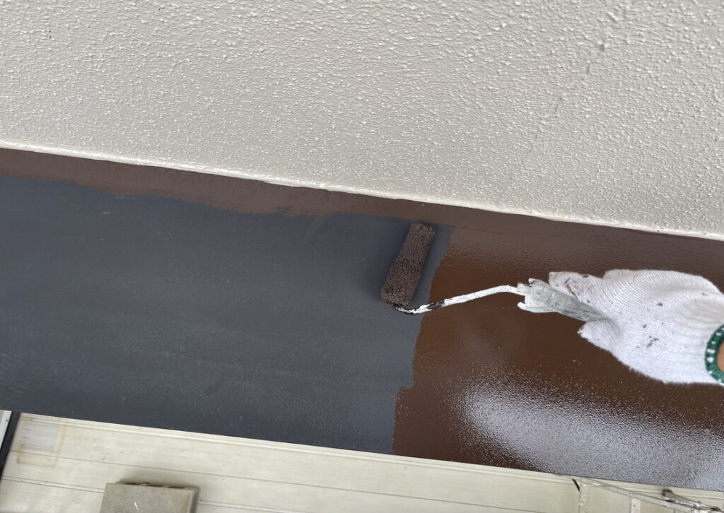 外壁屋根塗装同様、全体をしっかり高圧洗浄とケレンをしたら、1回目の塗装です。下塗り(したぬり)といいますが鉄部の場合は。さび止めをぬります。外壁塗装同様、原則、下塗り(さび止め)、中塗り、仕上げ塗り(上塗り)の3回です。(下写真)黒色の錆止めを使用しております。