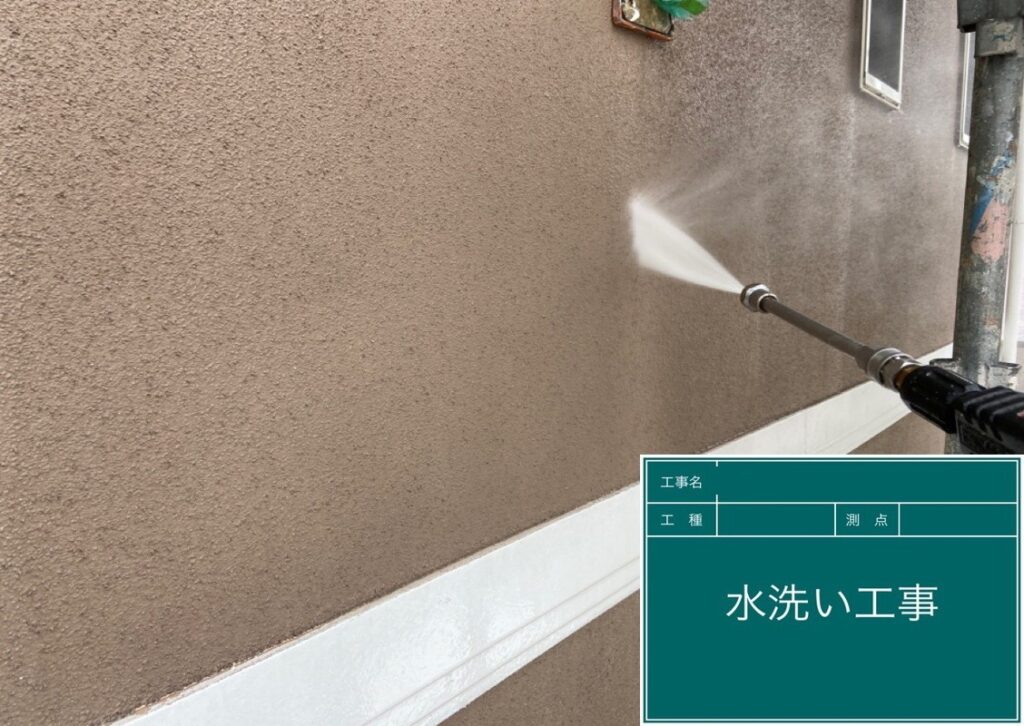 まず、塗装の前に高圧洗浄で、コケや汚れ、黒ずみ、旧塗膜等をしっかり落としていきます!高圧洗浄でしっかりと旧塗膜や汚れを落としておくことで、塗料の密着性を良くする効果を発揮できるからです。