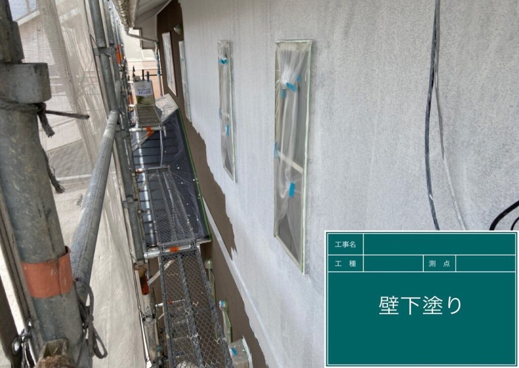 全体をしっかり高圧洗浄したら、1回目の塗装です。下塗り(したぬり)といいます。単層と複層塗料の違いで工程が変わる場合がありますが、原則、下塗り、中塗り、仕上げ塗り(上塗り)の3回です。