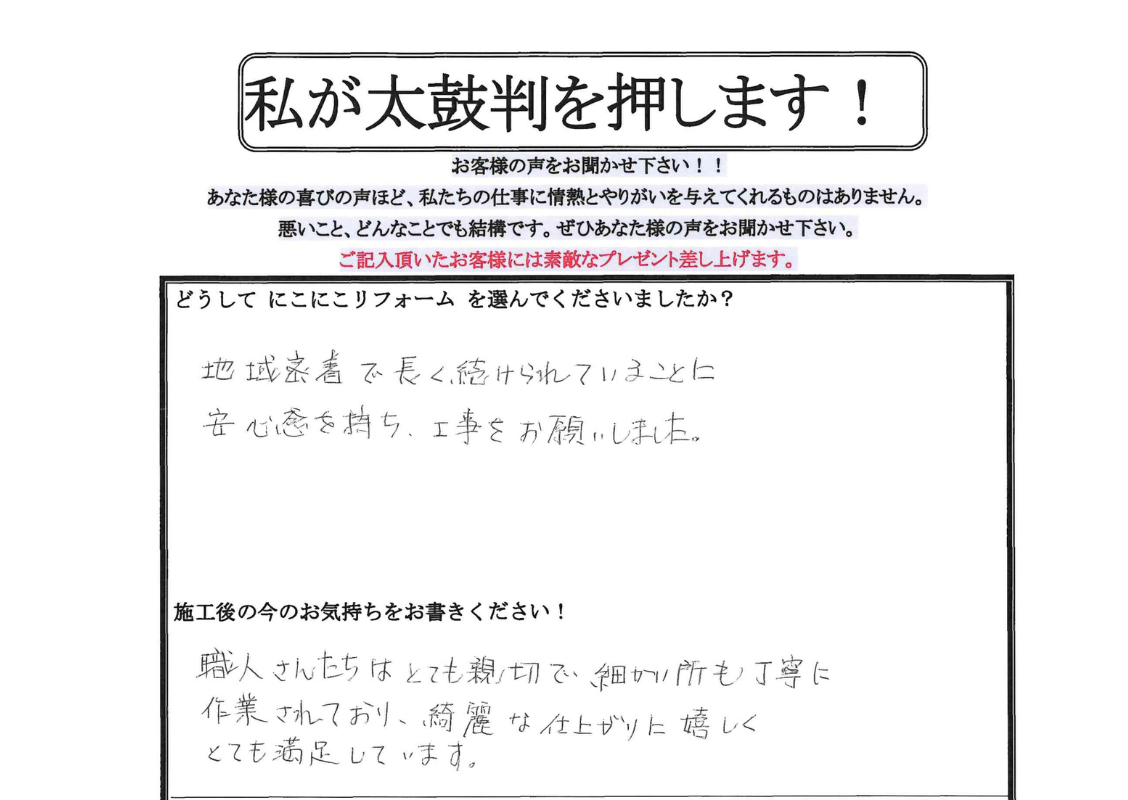この度は数ある塗装会社の中からにこにこリフォームをお選びいただき有り難う御座いました。H様にお喜びいただけました事、大変嬉しく思います。また何かございましたらいつでもご連絡ください。今後ともどうぞよろしくお願いいたします。