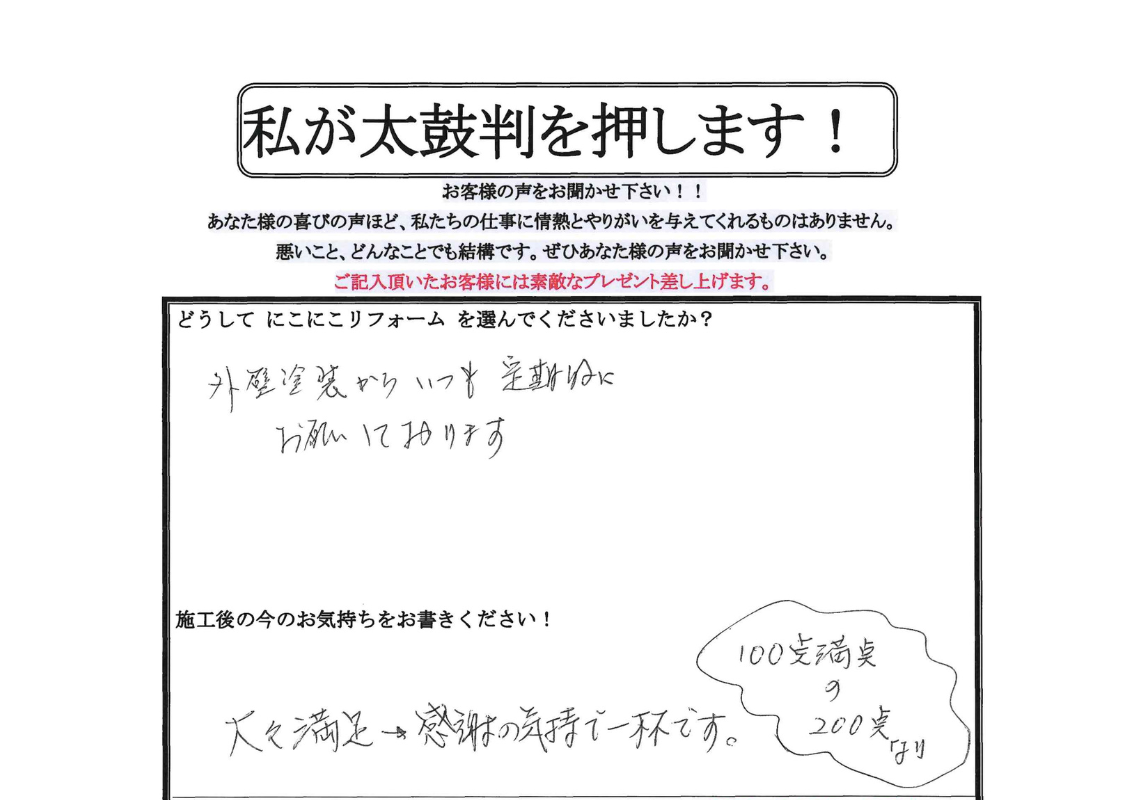 口コミ評判2025.05.28大々満足!感謝の気持ちで一杯です。宝塚市中山寺 T様 お客様の口コミをご紹介!Q. どうしてにこにこリフォームを選んでくださいましたか?外壁塗装からいつも定期的にお願いしております。Q. 施工後の今のお気持ちをお聞かせください。大々満足→感謝の気持ちで一杯です。100点満点の200点なり。岡本隆幸T様、いつもお世話になっております。今回の屋根工事も弊社にお任せいただき誠にありがとうございました。そして大変嬉しいお言葉を頂けました事、心から感謝しております。これからも精進して参りますのでどうぞよろしくお願いいたします。何かお困りのことがございましたらいつでもご連絡ください。伊丹店代表親方 岡本隆幸T様邸の施工事例はこちら無料お見積はこちら