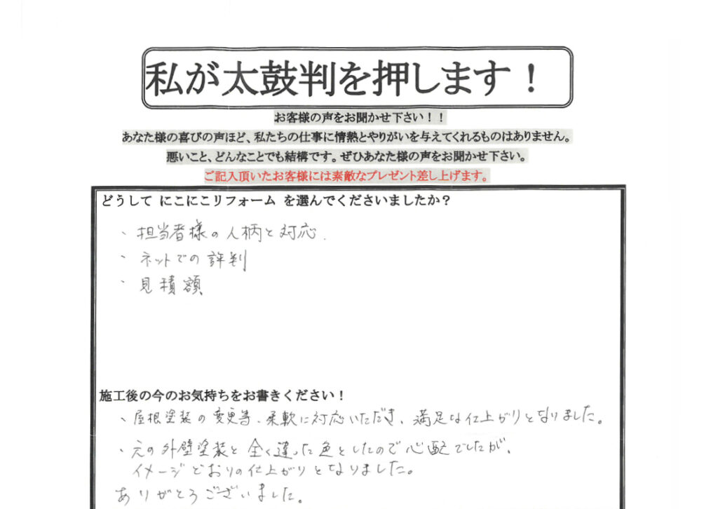 口コミ評判2021.05.31柔軟に対応いただき、満足な仕上がりとなりました!イメージどおりの仕上がりとなりました。伊丹市O様お客様の口コミ紹介!カスタマーレビュー ★★★★★Q. どうしてにこにこリフォームを選んでくださいましたか?・担当者様の人柄と対応・ネットでの評判・見積額Q. 施工後の今のお気持ちをお聞かせください。・屋根塗装の変更等、柔軟に対応いただき、満足な仕上がりとなりました。・元の外壁塗装と全く違った色としたので心配でしたが、イメージどおりの仕上がりとなりました。ありがとうございました。無料お見積はこちら