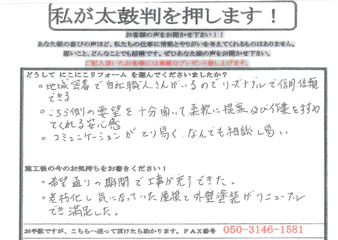 T様、この度は工事をおまかせ頂きありがとうございました。軽くて丈夫なガルテクトの屋根・放熱効果のある塗料で新築に戻ったような綺麗さに私たちも最高の仕事が出来たのではないかと自負しております。これから長いお付き合いの始まりです。お家の事で何かありましたらご遠慮なくお申し付けください!今後ともよろしくお願い致します」