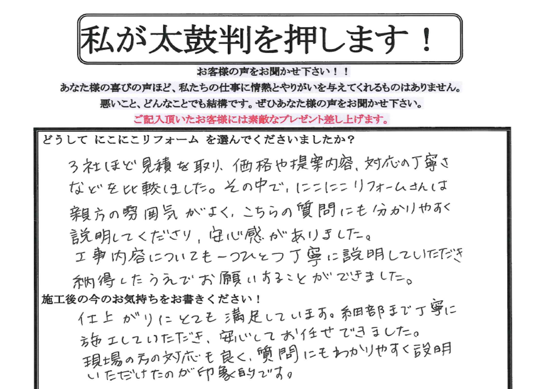Q. どうしてにこにこリフォームを選んでくださいましたか?