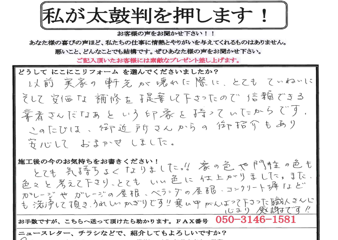 この度は御近所さんからのご紹介もあり安心してお任せしました。