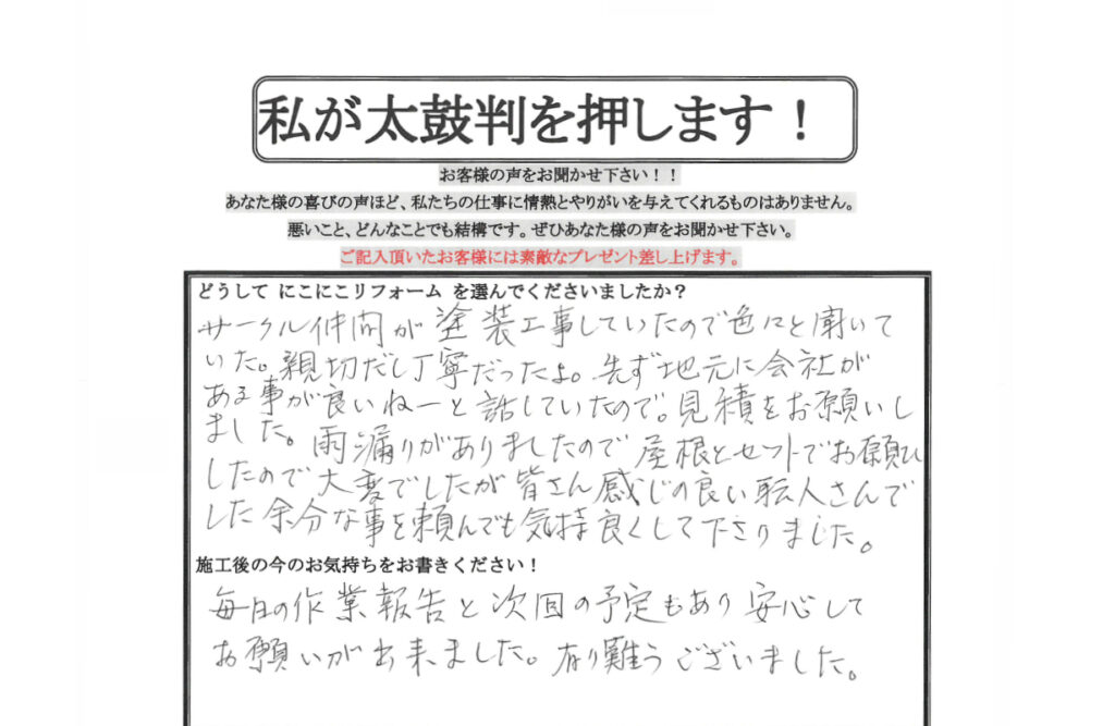 Q. どうしてにこにこリフォームを選んでくださいましたか?