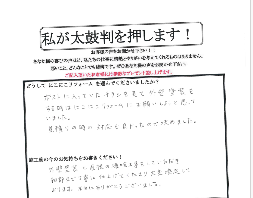 口コミ評判2025.12.22外壁塗装と屋根の漆喰工事をしていただき、細部まで丁寧に仕上げてくださり、大変満足しております。神戸市北区 K様 お客様の口コミをご紹介!Q. どうしてにこにこリフォームを選んでくださいましたか?ポストに入っていたチラシを見て外壁塗装をする時はにこにこリフォームにお願いしようと思っていました。見積りの時の対応も良かったので決めました。Q. 施工後の今のお気持ちをお聞かせください。外壁塗装と屋根の漆喰工事をしていただき、細部まで丁寧に仕上げてくださり、大変満足しております。本当にありがとうございました。井町圭吾「代表親方の井町です。Kさんありがとうございました。大変嬉しいお声をいただき、心から感謝しております。お客様の喜びが私たちの励みになります。これからもお客様目線で誠実にお仕事できるよう努めてまいります。誠にありがとうございました。」神戸北店 代表親方 一級塗装技能士:井町圭吾無料お見積はこちら