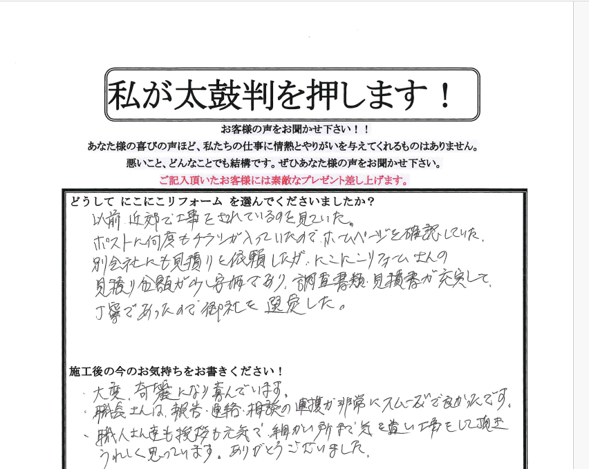 Q. どうしてにこにこリフォームを選んでくださいましたか?