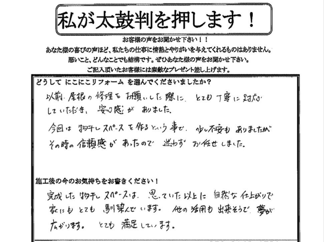 口コミ評判2025.06.17思っていた以上に自然な仕上がりで家にもとても馴染んでいます。他の活用も出来そうで夢が広がります。三田市 Y様 お客様の口コミをご紹介!Q. どうしてにこにこリフォームを選んでくださいましたか?以前、屋根の修理をお願いした際に、とても丁寧に対応したいただき、安心感がありました。今回は物干しスペースを作るという事で、少し不安もありましたがその時の信頼感があったので迷わずお任せしました。Q. 施工後の今のお気持ちをお聞かせください。完成した物干しスペースは、思っていた以上に自然な仕上がりで家にもとても馴染んでいます。他の活用も出来そうで夢が広がります。とても満足しています。高田一平「代表親方の高田です。Yさんありがとうございました。お客様の喜びが私たちの励みになります。これからもお客様目線で誠実にお仕事できるよう努めてまいります。誠にありがとうございました。」三田店 代表親方 一級塗装技能士:高田一平無料お見積はこちら