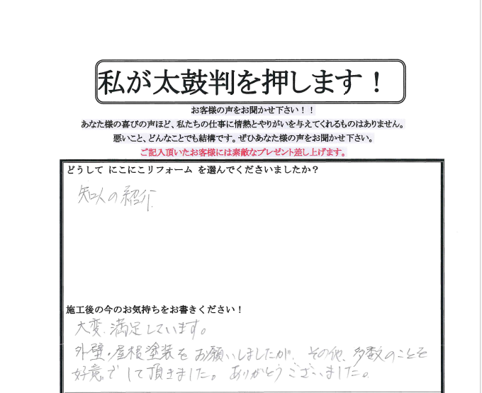 「今回は当店ではじめての塗装工事でしたが、ご信頼くださり誠にありがとうございました。塗装工事業は塗装をしてからが本当のお付き合いの始まりですので、何か気になることが出てきましたら小さな事でもご連絡ください。これからもどうぞよろしくお願い申し上げます。」