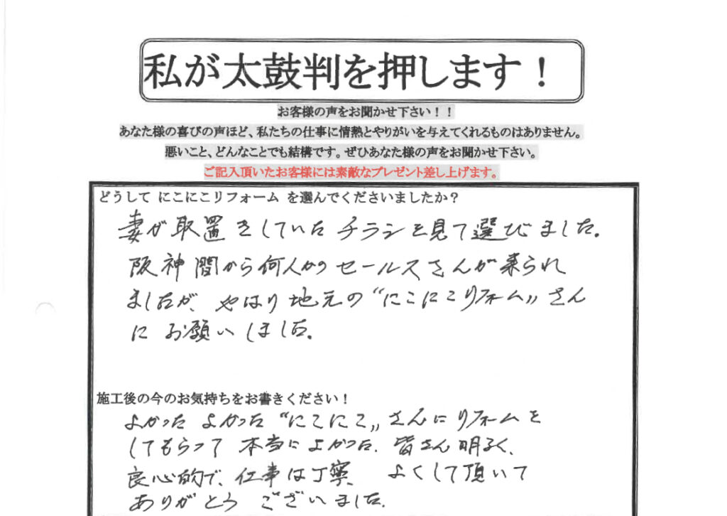 口コミ評判2021.02.28皆さん明るく良心的で、仕事は丁寧、よくして頂いてありがとうございました。三田市I様お客様の口コミ紹介!Q. どうしてにこにこリフォームを選んでくださいましたか?妻が取置きしていたチラシを見て選びました。阪神間から何人かのセールスさんが来られましたが、やはり地元の”にこにこリフォーム”さんにお願いしました。Q. 施工後の今のお気持ちをお聞かせください。よかった。よかった。”にこにこ”さんにリフォームをしてもらって、本当によかった。皆さん明るく良心的で、仕事は丁寧、よくして頂いてありがとうございました。無料お見積はこちら