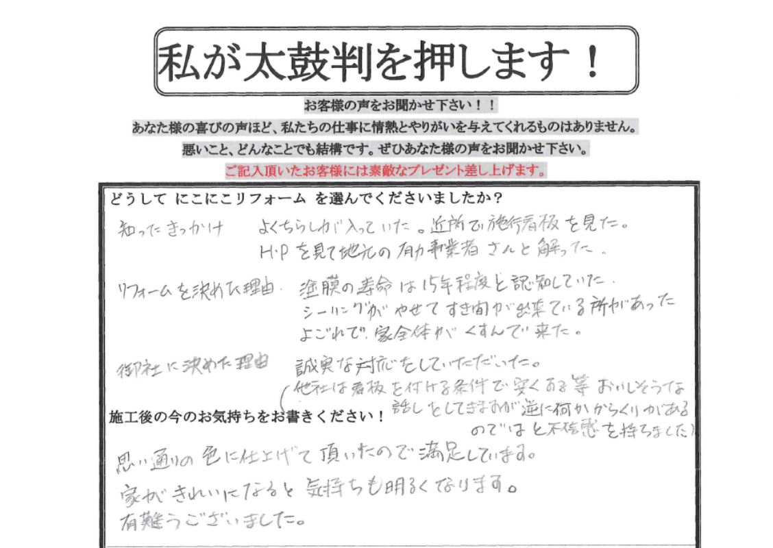 思い通りの色に仕上げていただいたので満足しています。家がきれいになると気持ちも明るくなります。有難うございました。