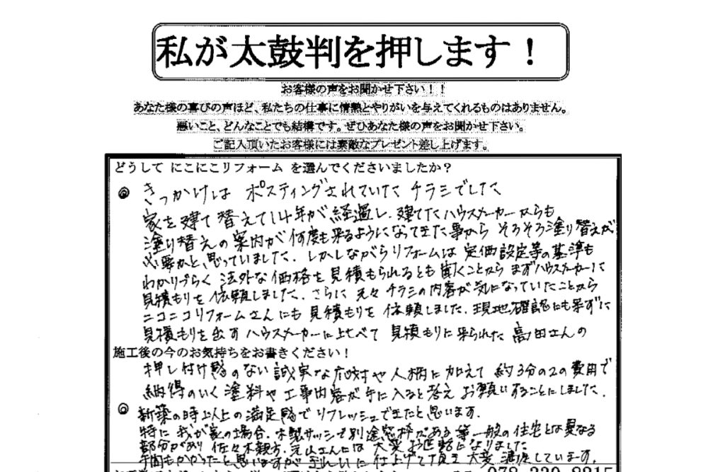 現地確認も来ずに見積もりを出すハウスメーカーに比べて、見積もりに来られた高田さんの押し付け感のない誠実な応対や人柄に加えて、約3分の2の費用で納得のいく塗料や工事内容が手に入ると考え、お願いすることにしました。