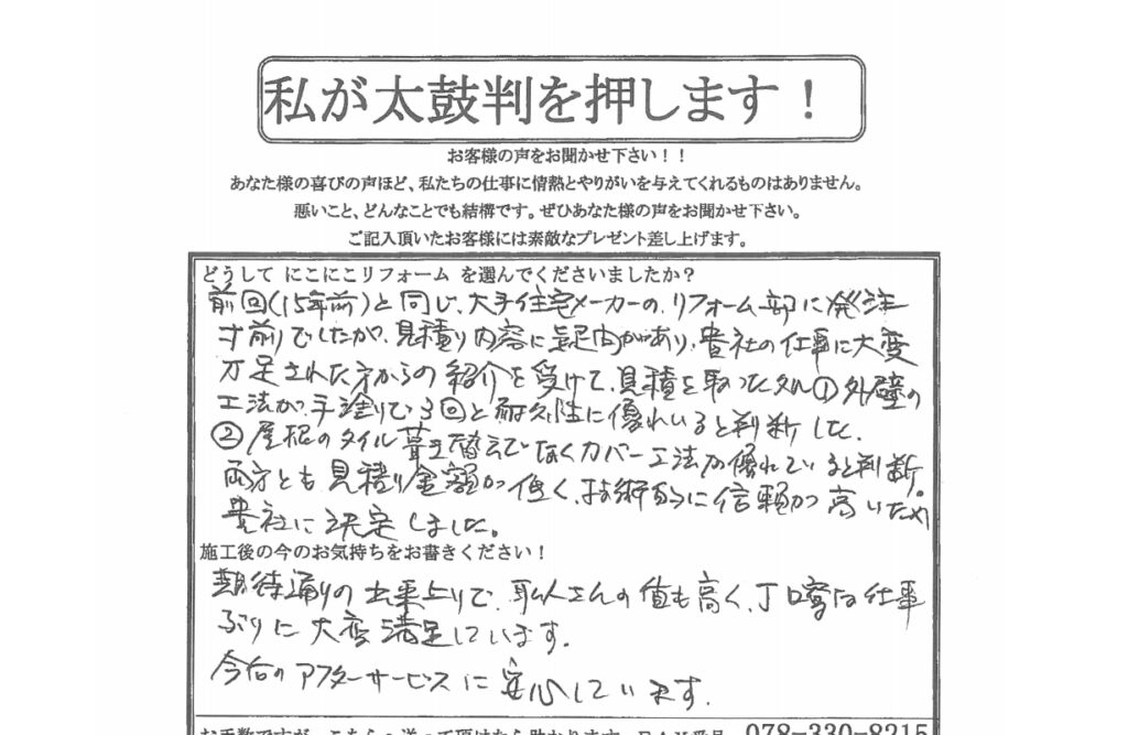 前回(15年前)と同じ、大手住宅メーカーのリフォーム部に発注寸前でしたが、見積り内容に疑問があり、貴社の仕事に大変満足された方からの紹介を受けて、見積を取った処、①外壁、②屋根のタイル葺き替えでなくカバー工法が優れていると判断。