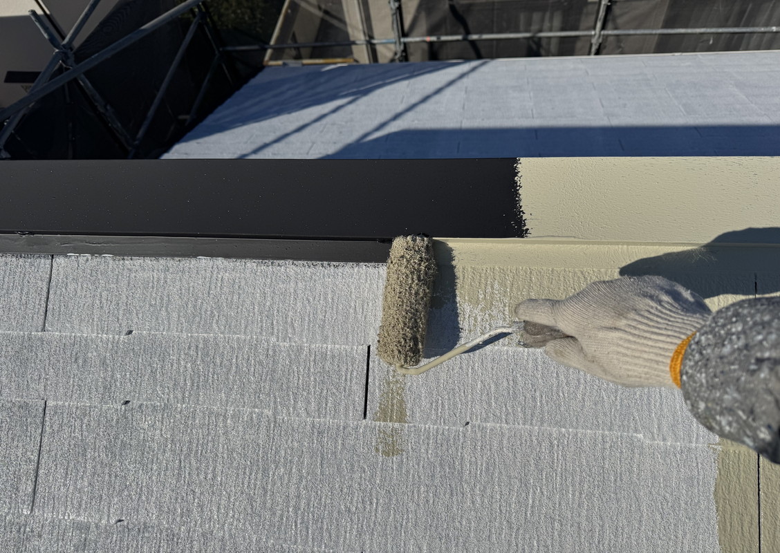 そして、次は、いよいよ中塗りです。今回は、お客様が選んでくれた外壁が淡いベージュ・屋根が鶯茶色ですね。塗料は外壁・屋根共に観音シリコンです。