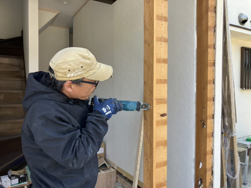本日の写真は玄関ドアを開き戸から引き戸に入れ替えと・玄関框入れ替え・玄関土間タイル張り替えをおこなっているところを撮影しました!
