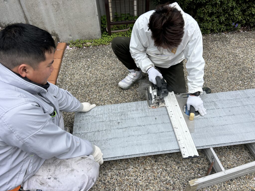 ↓まずは、マルチカッターで傷んだ部分の外壁サイディングをカットします。既存防水シートを破かないように慎重に♪