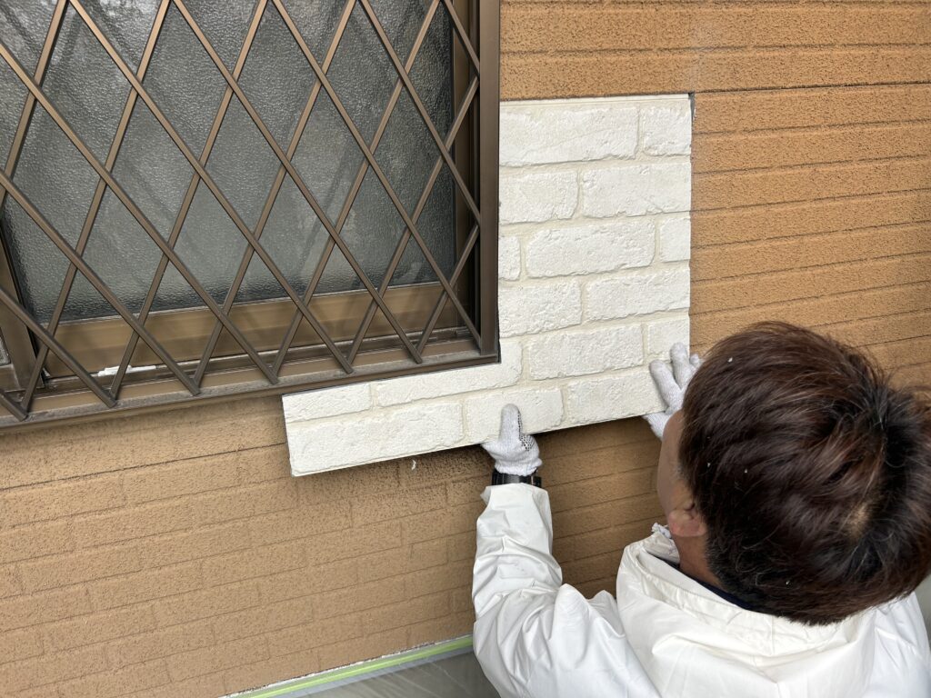 ↓既存外壁はリシン調のため、下塗り塗布後にリシンローラーで類似模様を復旧して仕上げました。